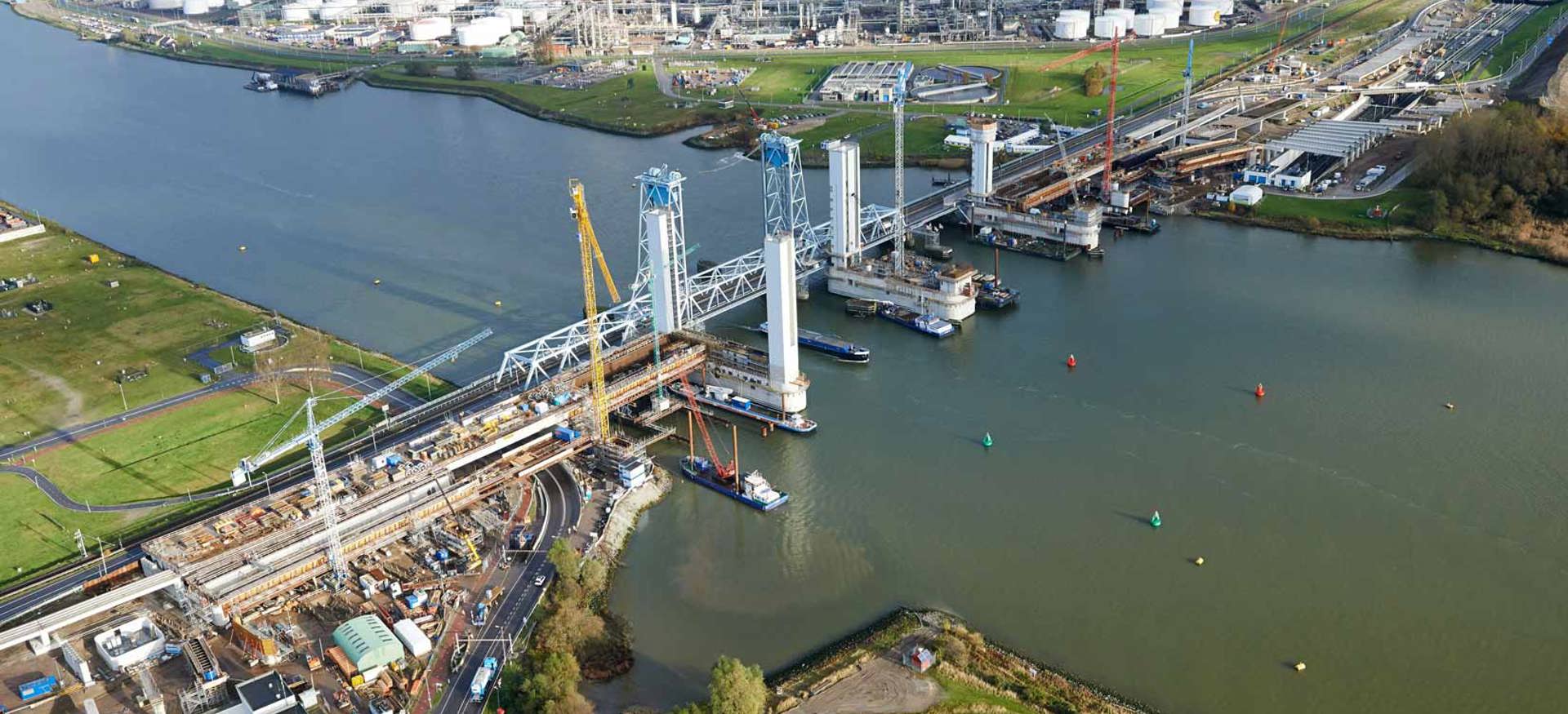The new Botlek Bridge is a lifting bridge with two bridge decks suspended between six lifting towers. Two sets of red cable pulleys are installed on each tower and the deck of the new Botlek Bridge is raised and lowered via cables running over these cable pulleys.