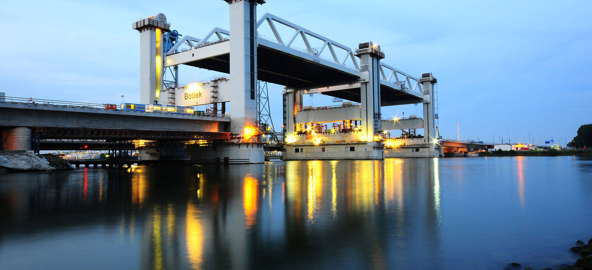 The most eye-catching landmark of the A15 Maasvlakte – Vaanplein motorway widening project is the new Botlek Bridge: one of the largest lifting bridges in Europe. The new bridge has a taller vertical clearance, which means a lower opening frequency, and shipping can simultaneously pass the bridge on both sides. In addition, the number of road lanes in both directions has been increased from one to two, promoting better traffic flow by road. The Botlek Road Tunnel is still in use, alongside the new bridge.