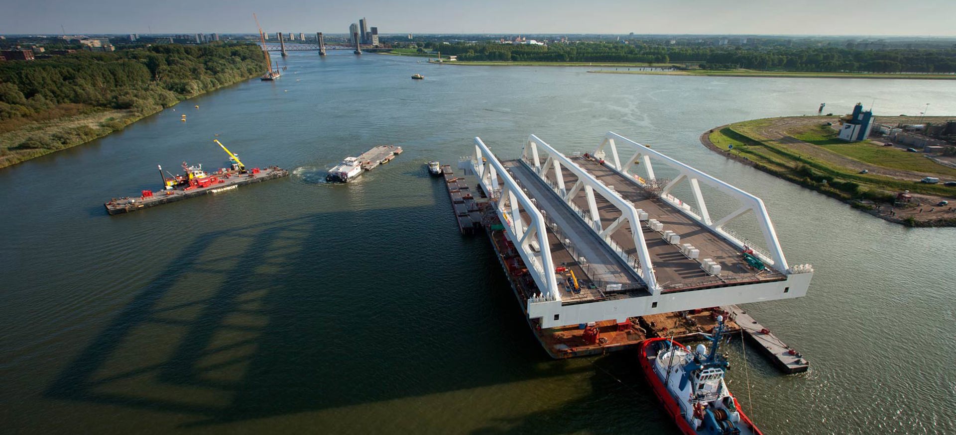 The separate components of the two decks were produced in Germany and were specifically designed to be suitable for transport by road. The components were brought to Schiedam by lorry in a total of 220 trips. The decks were assembled simultaneously on the pier at Mammoet before being floated into position. This approach, involving manufacture in Germany and assembly close to the bridge's location, is unique.