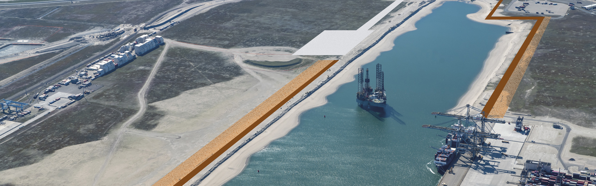 The new building work will be on either side of the harbour, which is approximately 2.5 kilometres long. In total, this includes 1,825 metres of deep-sea quay, 160 metres of inland shipping quay and 360 metres of earth-retaining walls. Barring 725 metres, this means that the entire harbour basin, which went into use in 2015, will be enclosed. The project also includes the construction of a 160-metre waiting area for general use by inland shipping vessels. The completion of the first 500 metres of quay wall is expected in late 2022. The final part of the project will be completed no more than eighteen months later.