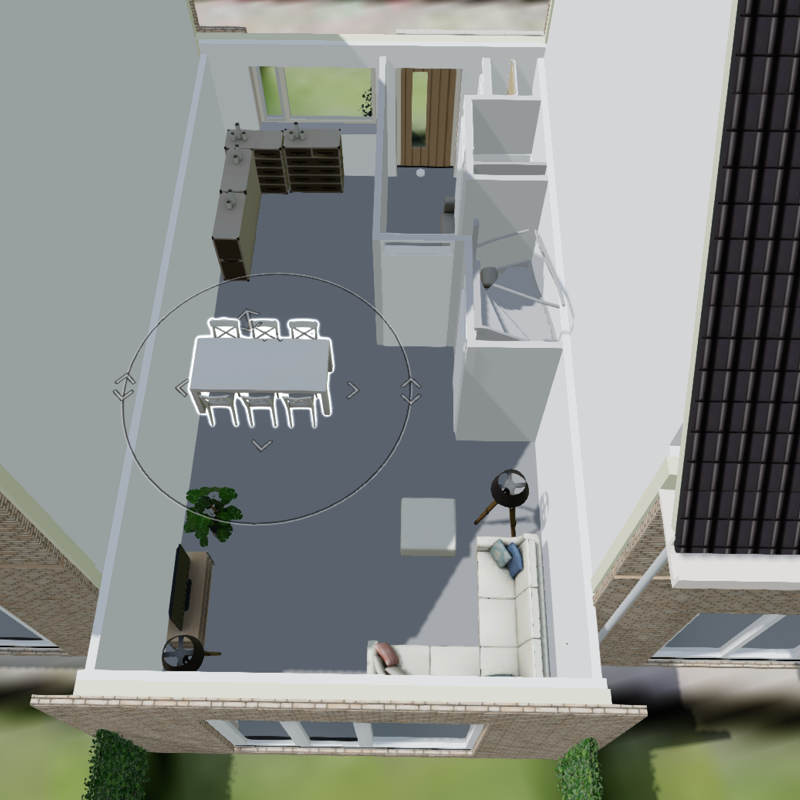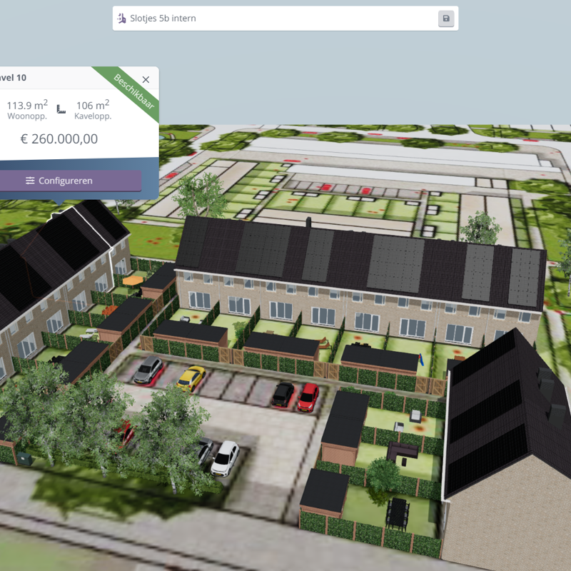 Our potential buyers of homes to which we are going to apply this will receive the login to their digital environment. In it, they see the lot map, with the countless options that our buyer counselors have added in the catalog. For example, a buyer can choose to apply an extension of 1.20 or 2.40 meters deep. Is the option for a 2.40 meter extension selected? Then the result can be seen immediately on the 3D model of the house. The buyer can view this result from all angles and can even virtually walk through the home. To make it complete, it is even possible to place furniture in the room, so that it is clear how, for example, a sofa would look like in the room.