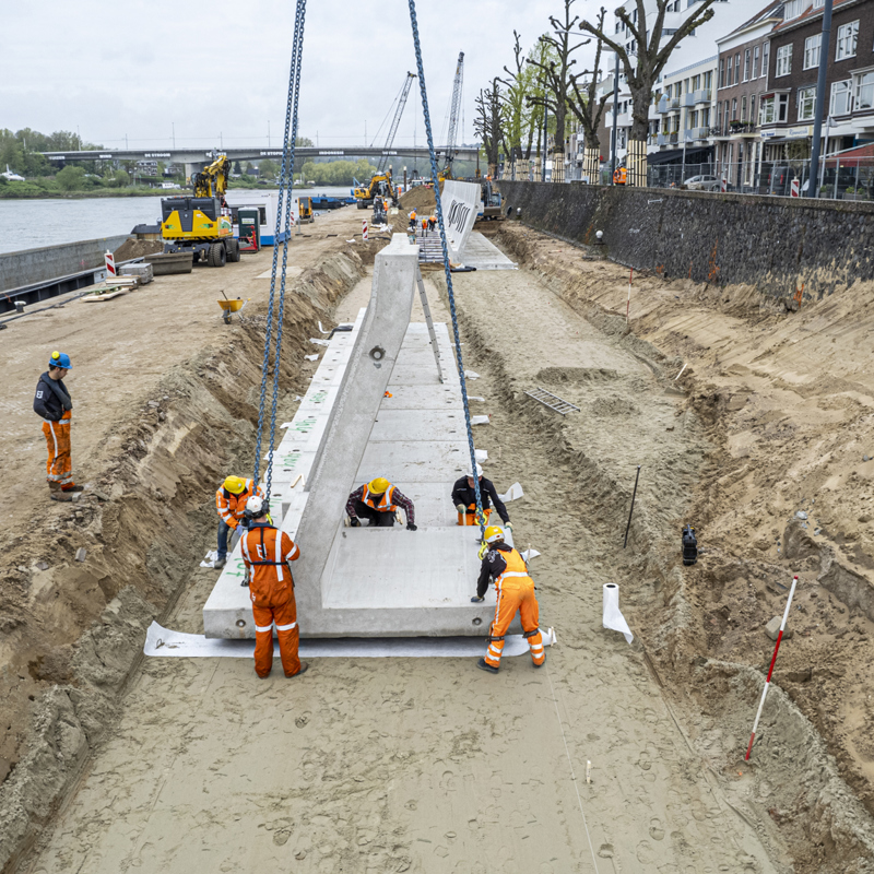 Sustainable construction and development is one of Ballast Nedam's biggest spearheads. Achieving emission-free construction sites by 2030 is an important step within this. In the project Versterking Rijnkade Arnhem, Ballast Nedam is further expanding the expertise and experience required for this. This means solving two sustainability questions with one solution: tackling the quay simultaneously contributes to protection against high-water levels, which are becoming more frequent due to climate change.