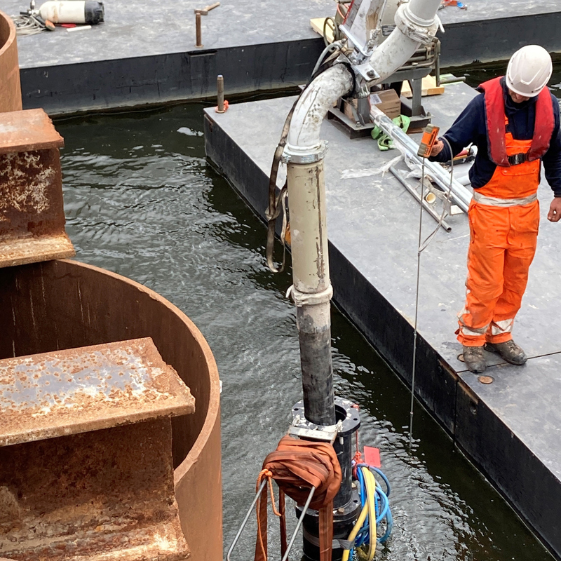 In preparation for this milestone, we poured gravel in a 1:5 profile, measured anchor piles with multibeam and sunk reinforcement cages under difficult conditions. After the pour has taken place, work will continue on the concrete work to which one of the zinc elements of the Maasdelta tunnel will connect in a later phase.