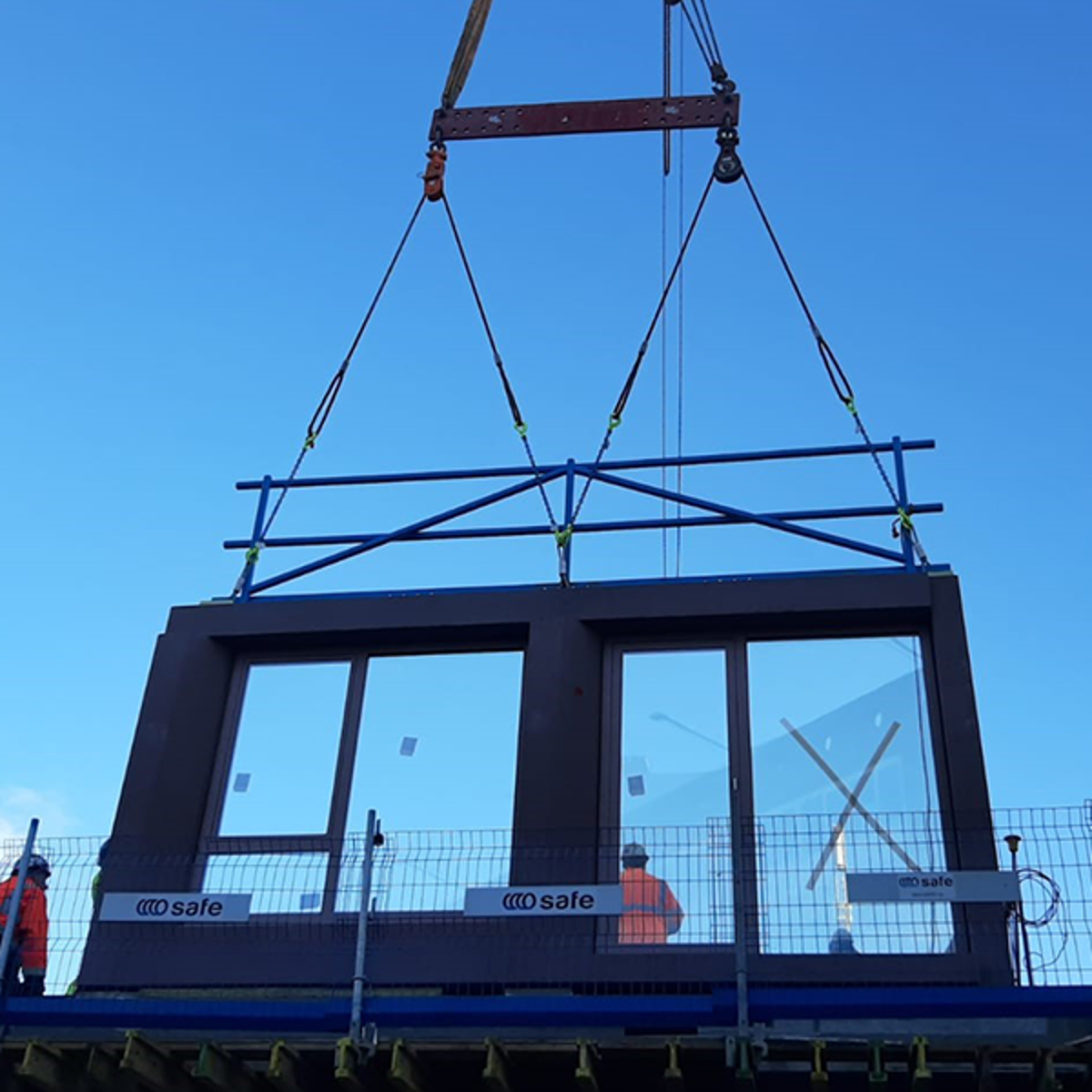 HighNote's façade is constructed almost entirely of prefabricated elements. Before installation, the top of each element is fitted with a specially developed safety fence that also serves as an edge box and brace. A number of elements were fitted with the balconies on site, including panel fencing with glass infill, before being mounted on the building.