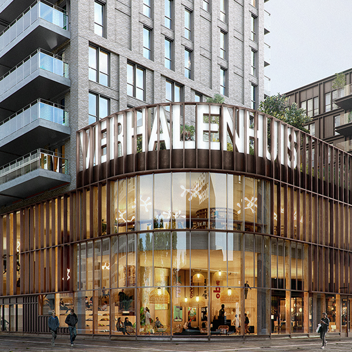 The ground floor will house shops, offices and the arts and culture centre the Verhalenhuis. The Verhalenhuis is a collaboration between the Amsterdam Public Library, El Hizjra (centre for Arabic art and culture), radio station FunX and film house Oxville. The Verhalenhuis will have a broad and active programme for the neighbourhood and will be an open and accessible meeting place.