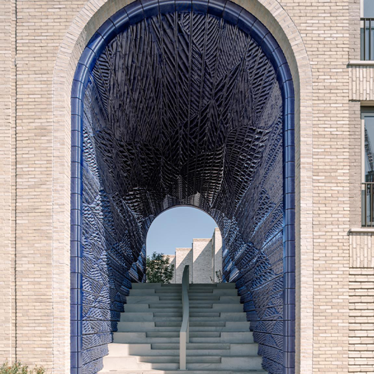 Two special gateways give access to PoortMeesters. The metre-high walls are lined with 4,000 ceramic tiles: each one unique and 3D-printed. Together, they form a Delft Blue work of art that has been pieced together like a giant jigsaw puzzle. The gateways are inspired by classic Delft Blue tableware and serve to frame the view of the courtyard garden. A visual statement designed by architectural design firm Studio RAP.