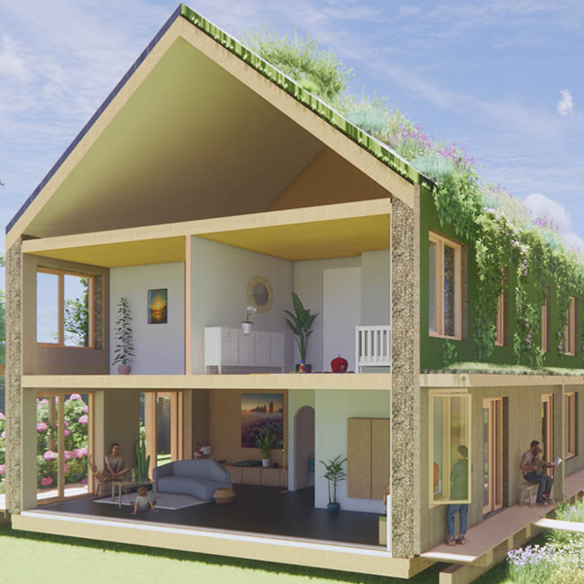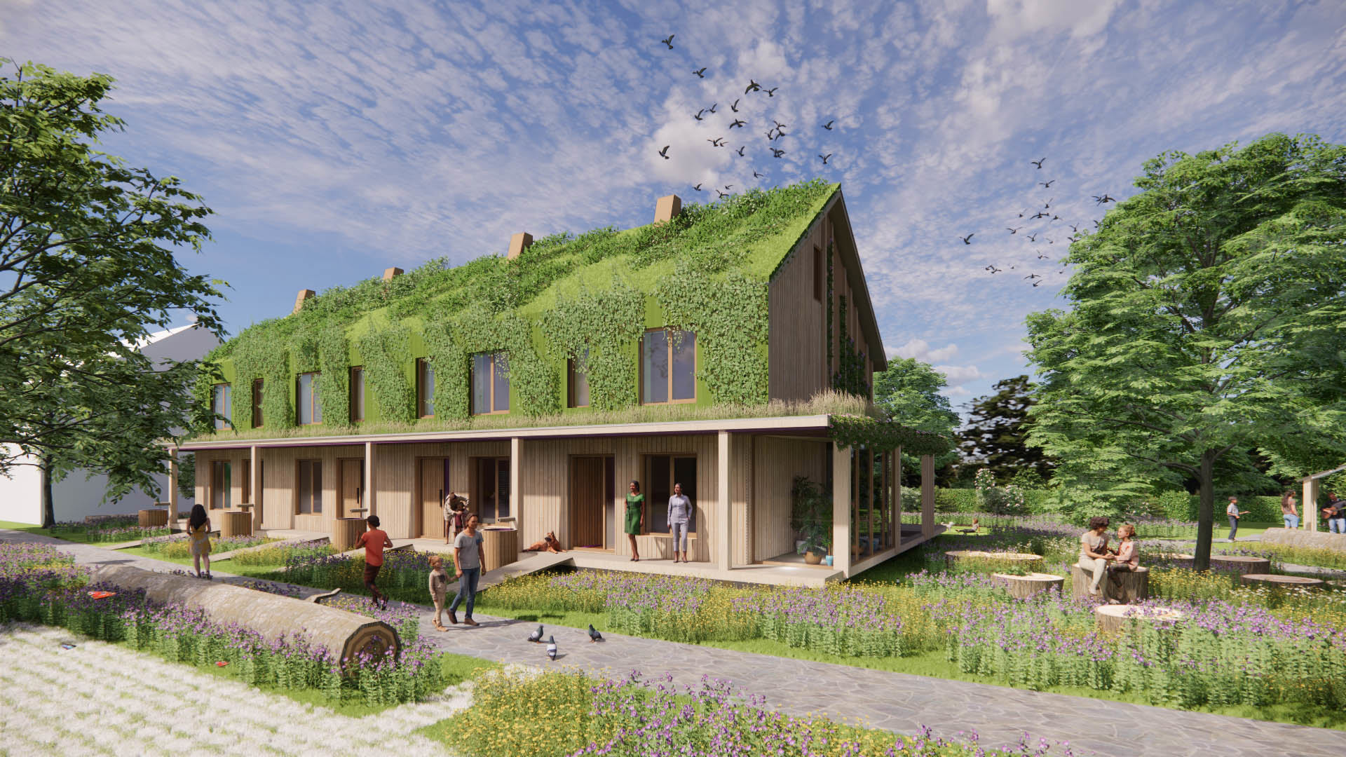 Because more than 95% of the houses are made of natural materials such as straw, a residual product from the agricultural sector, the materials save as much as 90 tonnes of CO2. Moreover, the Nature House generate as much as 10% extra energy. So you can actually think of them as little power plants. The façade and roof are largely covered with greenery. This greenery and the natural building materials act as a buffer for water management and combat heat stress.