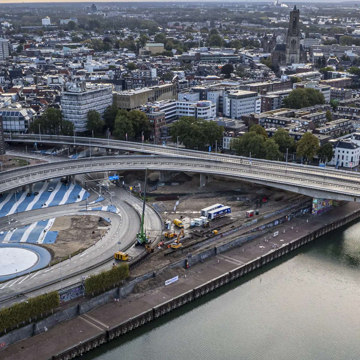 Commissioned by the Rijn and IJssel Water Board and the municipality of Arnhem, we are ensuring that the Rijnkade reinforcement will last for another 100 years and the city will be protected from high water. Nearly all the construction equipment we use on site is electric. Next to that, we supply almost all concrete work by water from our water hub. From our land hub, we make sure to always leave with a full truck. Working from these hubs saves a lot of transport movements.